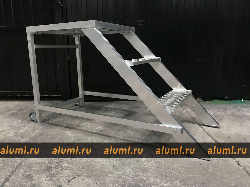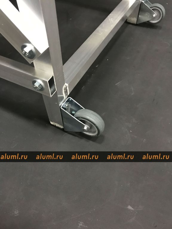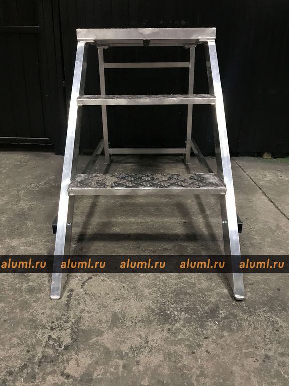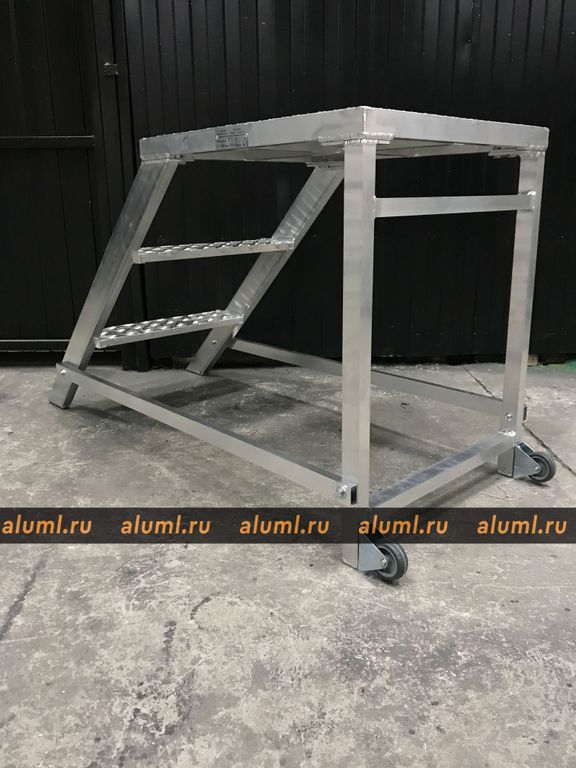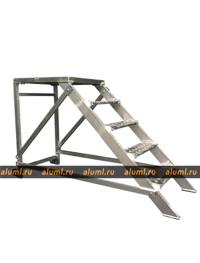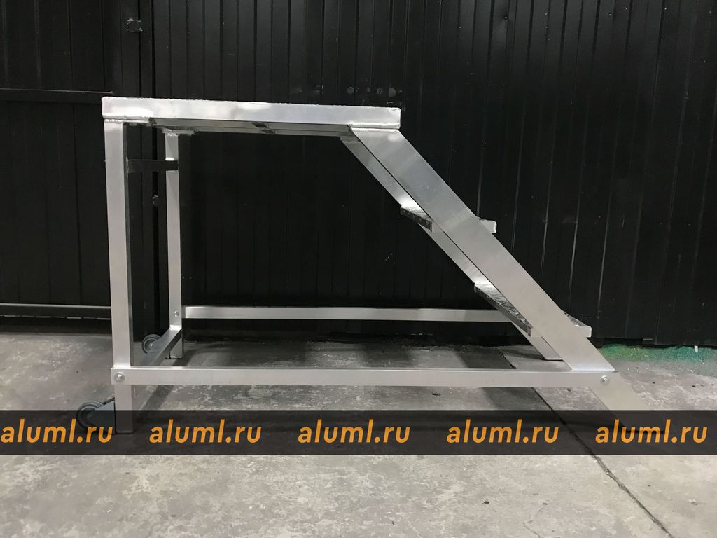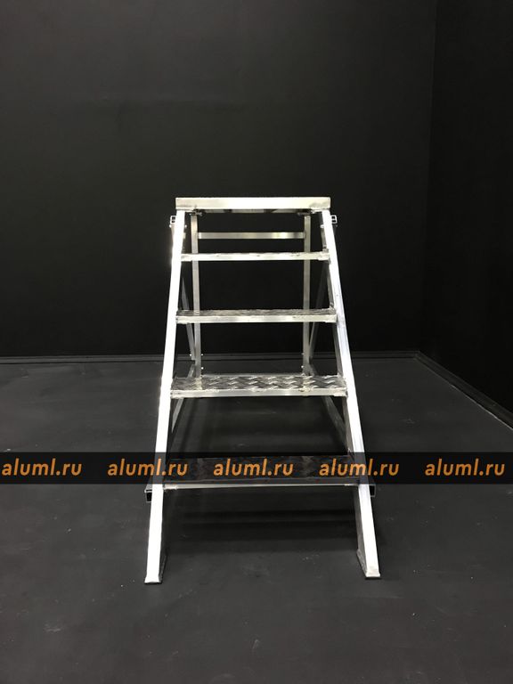 Лестница подмость ЛП-1.0 мобильная оборудована четырьмя ступенями и весит около 6 кг. Её сварная конструкция, выполненная из алюминиевых труб, обеспечивает надежное удержание ступеней и верхней площадки.