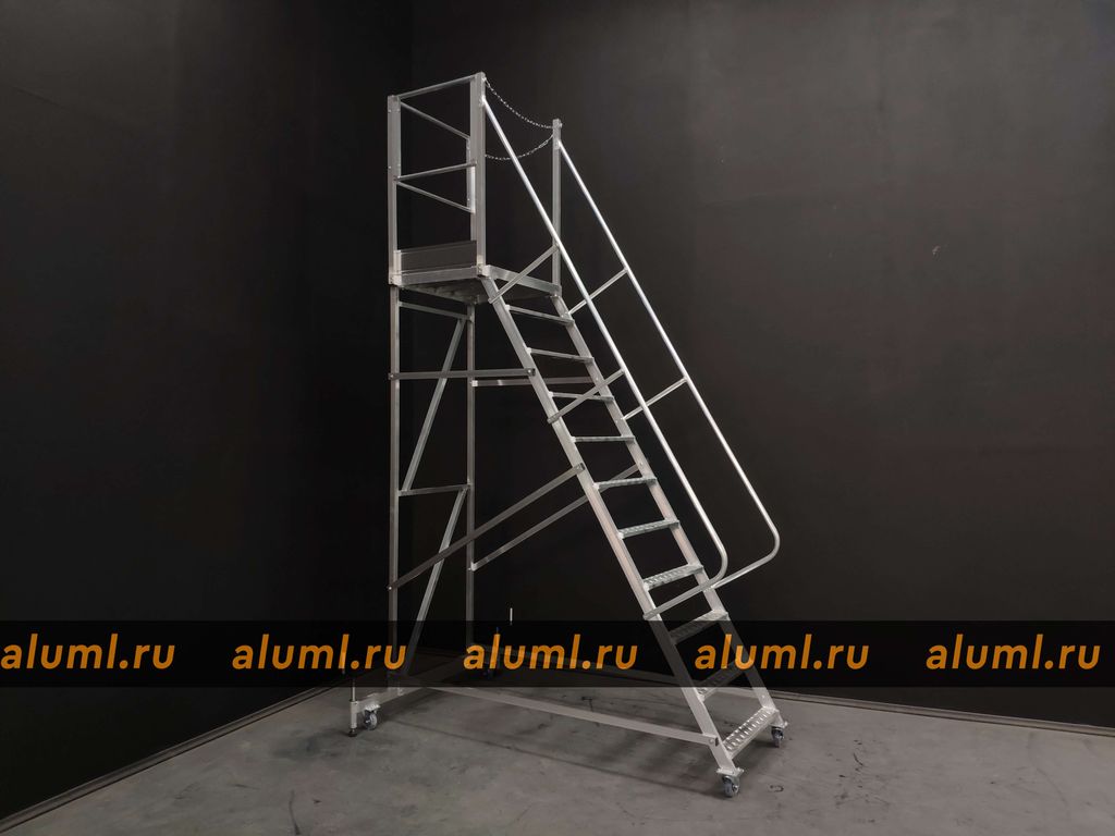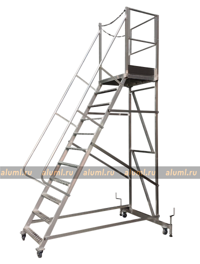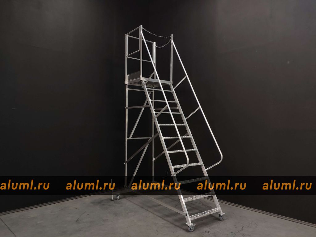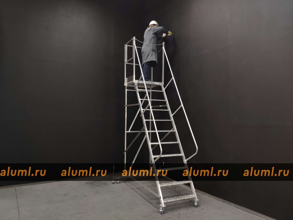 - Эта передвижная лестница имеет самоопору и не требует дополнительных креплений. Оснащена колесами с системой стопоров.