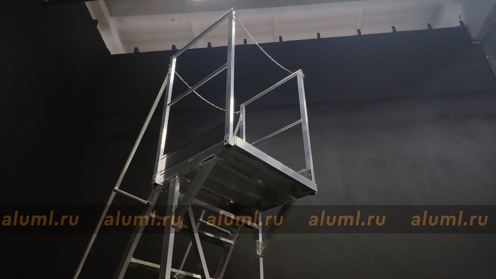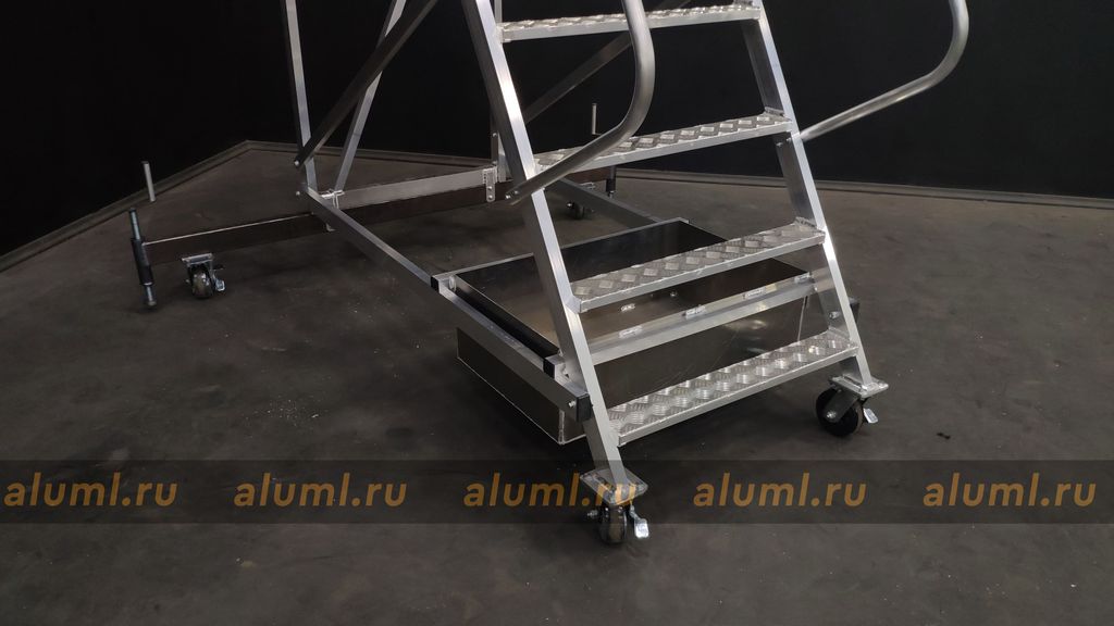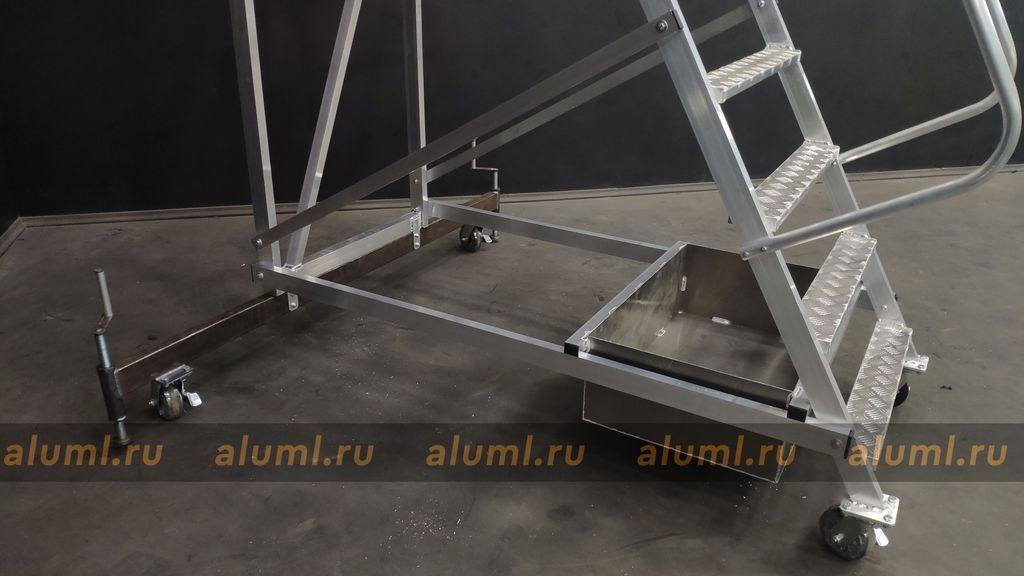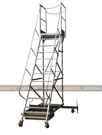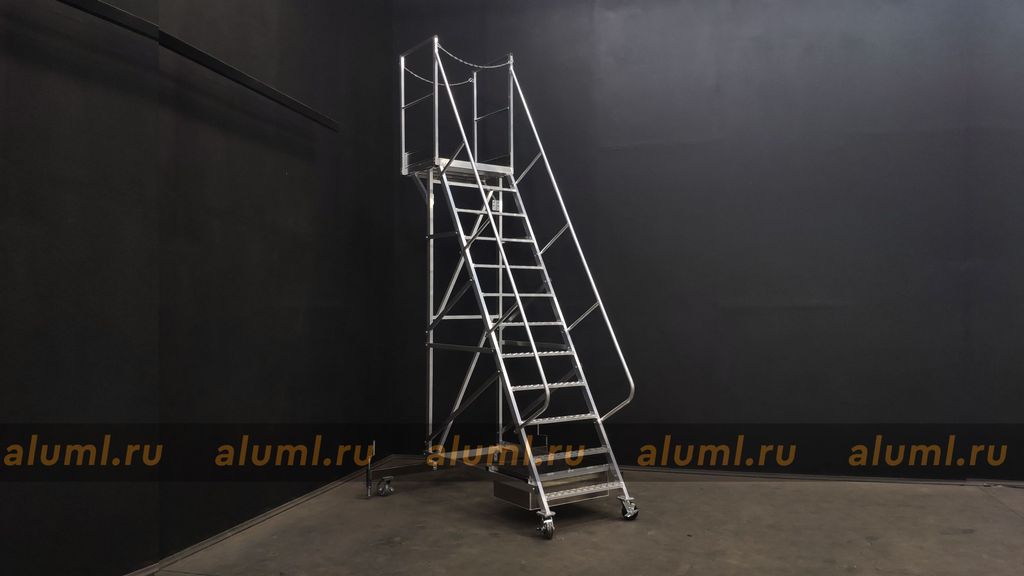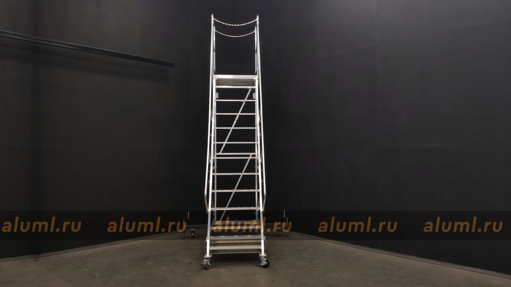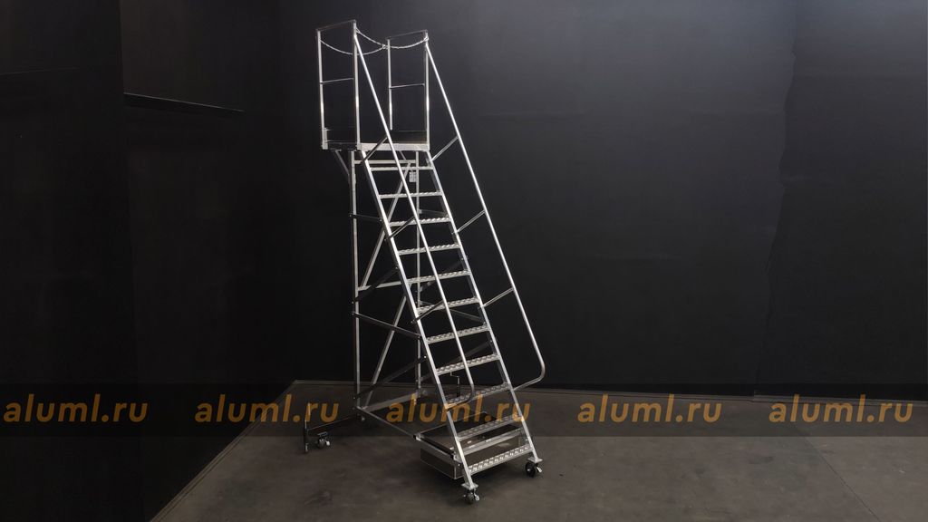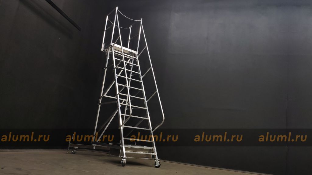 - Эта передвижная лестница имеет самоопору и не требует дополнительных креплений. Оснащена колесами с системой стопоров.