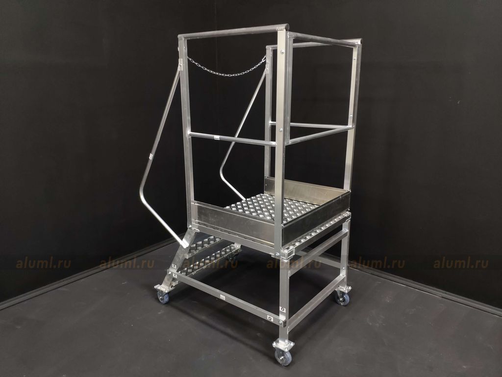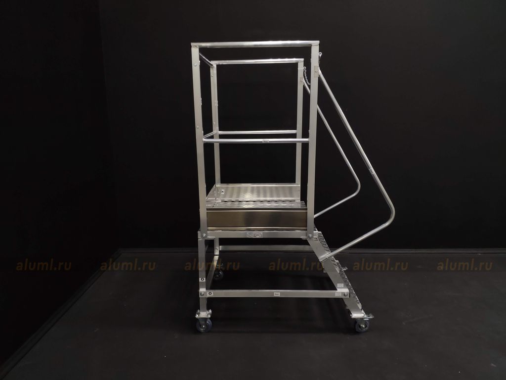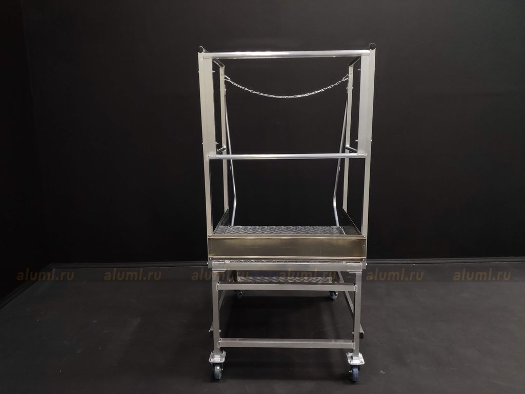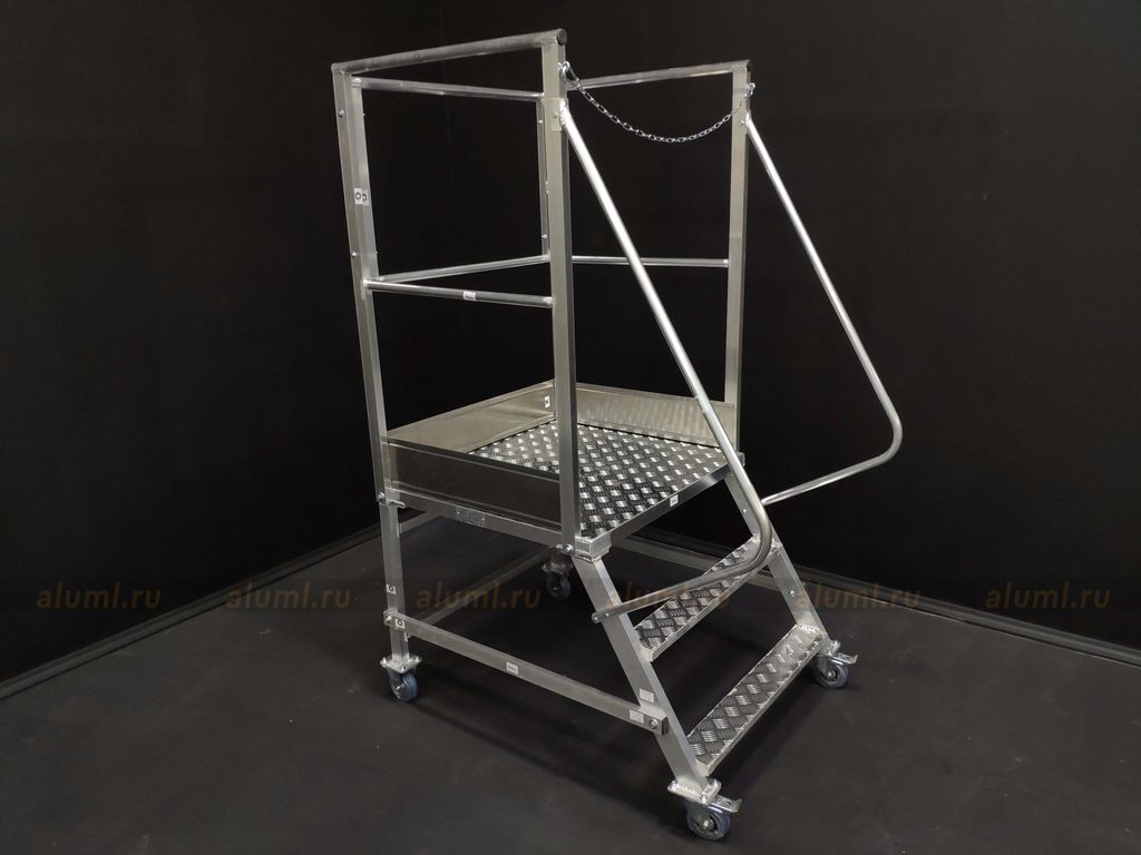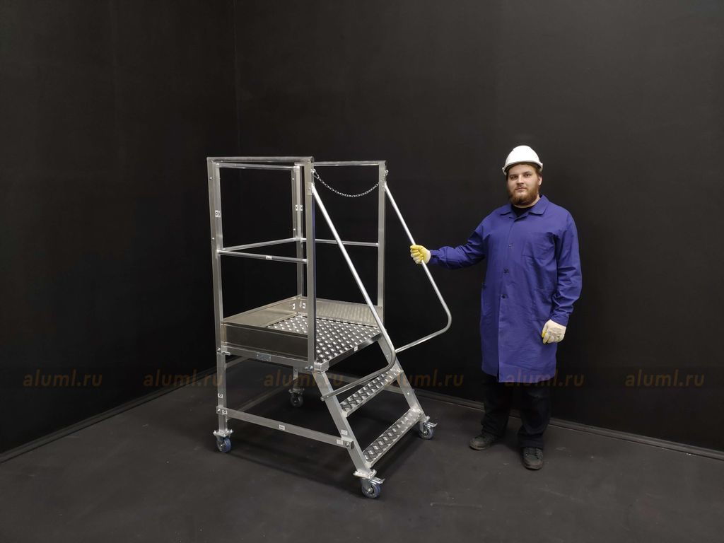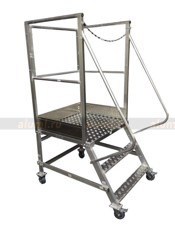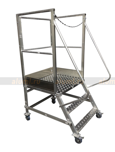 - Эта передвижная лестница имеет самоопору и не требует дополнительных креплений. Оснащена колесами с системой стопоров.