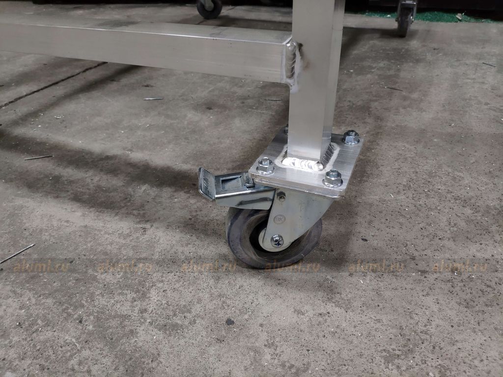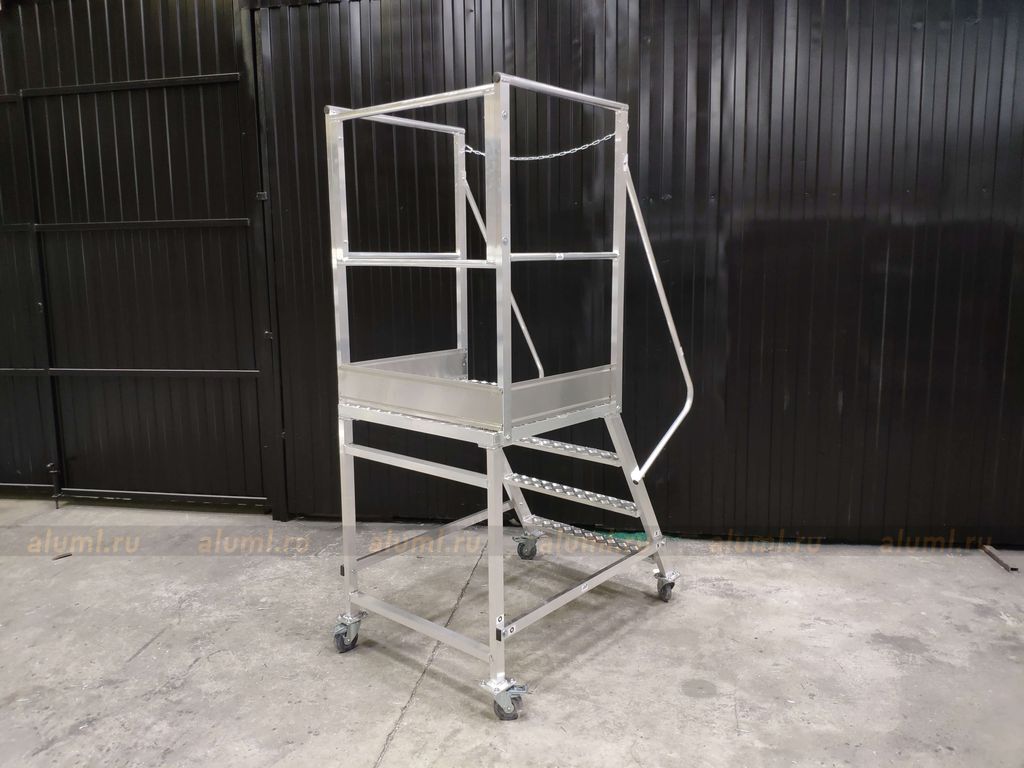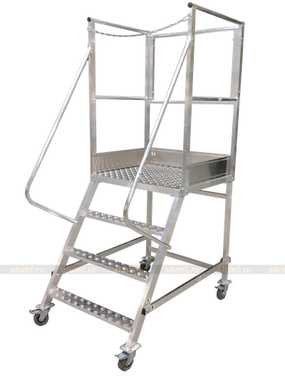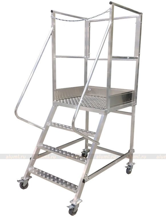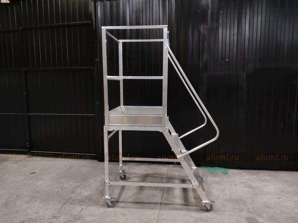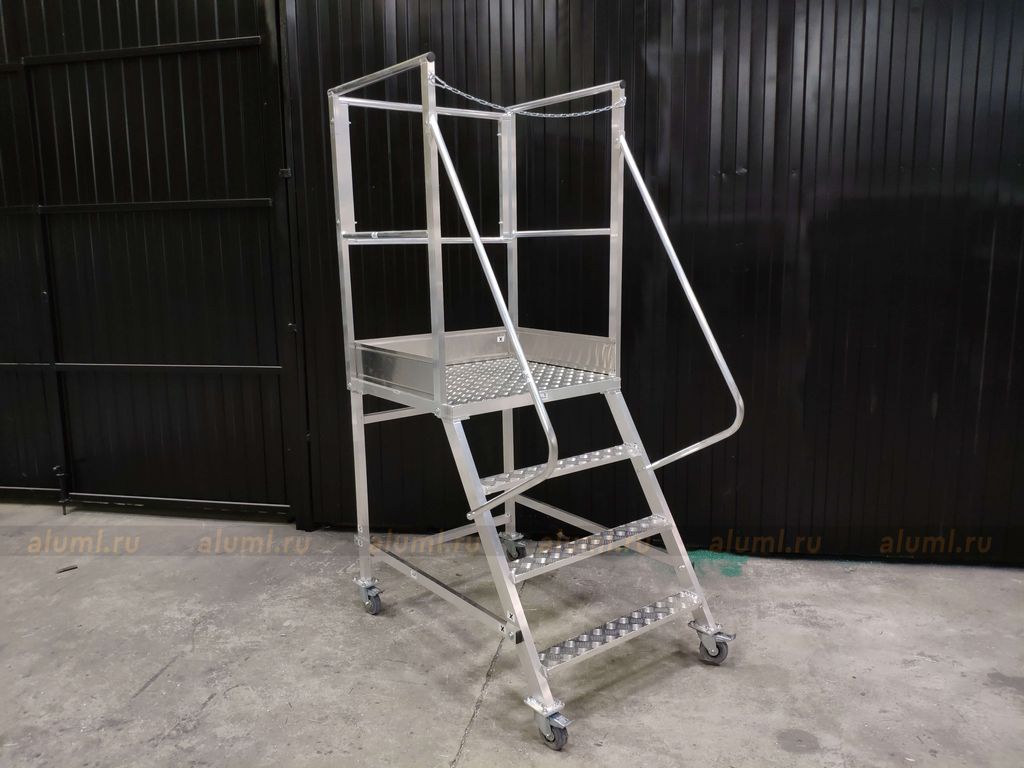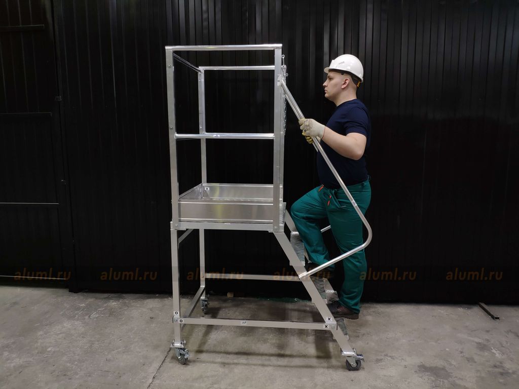 - Эта передвижная лестница имеет самоопору и не требует дополнительных креплений. Оснащена колесами с системой стопоров.