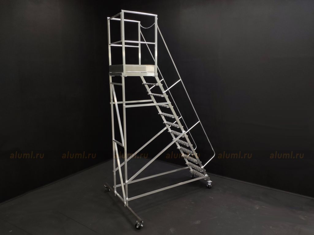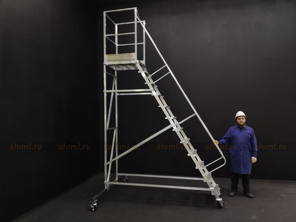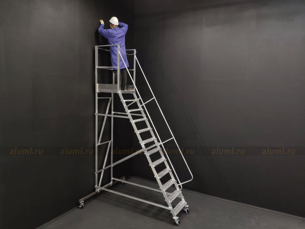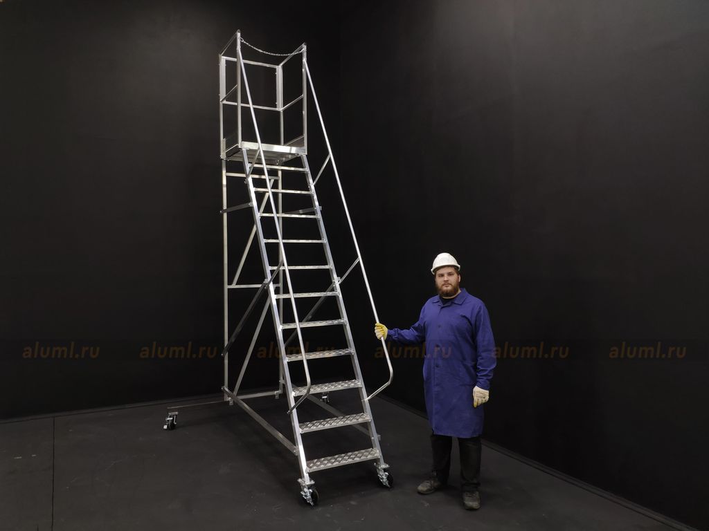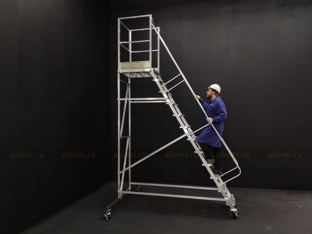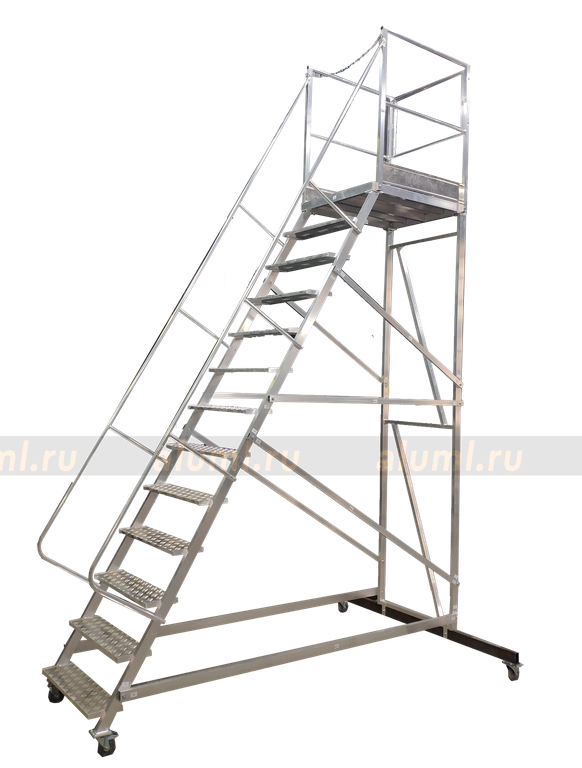 - Эта передвижная лестница имеет самоопору и не требует дополнительных креплений. Оснащена колесами с системой стопоров.