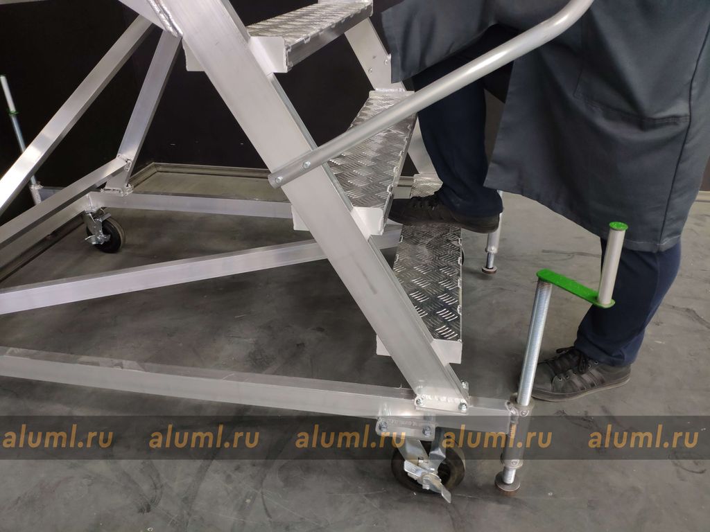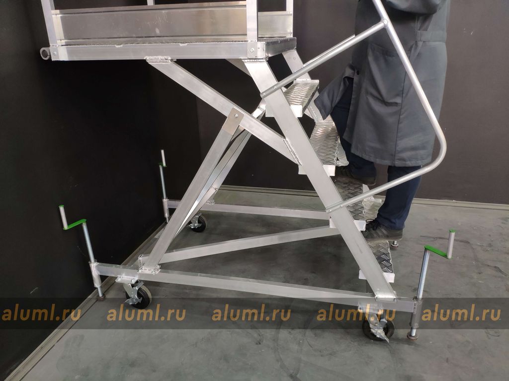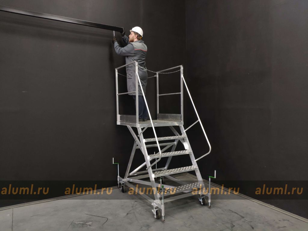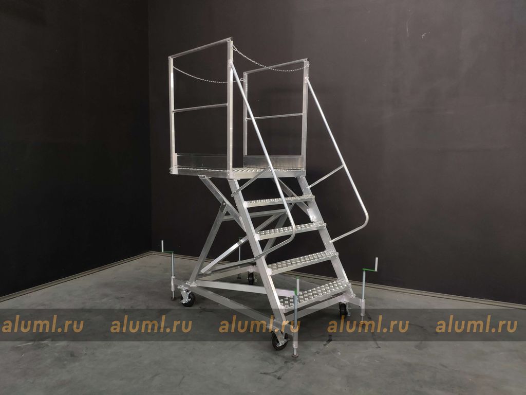 Передвижная алюминиевая стремянка – это сварная конструкция, изготовленная из алюминиевых сплавов, с перфорированными настилами площадки и ступеней. Особенностью этой лестницы является её собственная устойчивость в рабочем положении, которая позволяет обойтись без крепления к несущим конструкциям зданий или сооружений. Благодаря колесным опорам, стремянка может удобно перемещаться вдоль фронта работ. Вертикальные стойки изготовлены из алюминиевого профиля прямоугольного сечения. Для обеспечения дополнительной устойчивости конструкции, кроме колесных опор, предусмотрены четыре винтовых опоры. Огражденная площадка по бокам создана для обеспечения безопасности и удобства во время работ на высоте, а также для формирования рабочей зоны вблизи места выполнения задач.