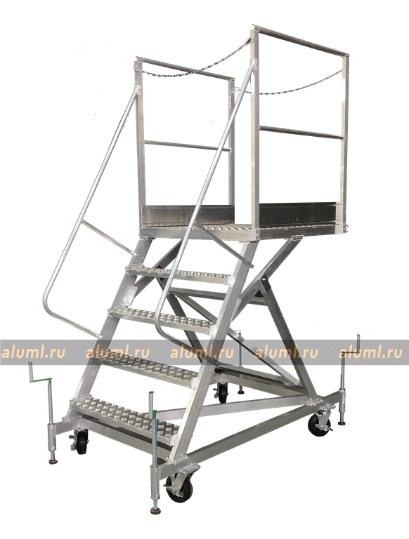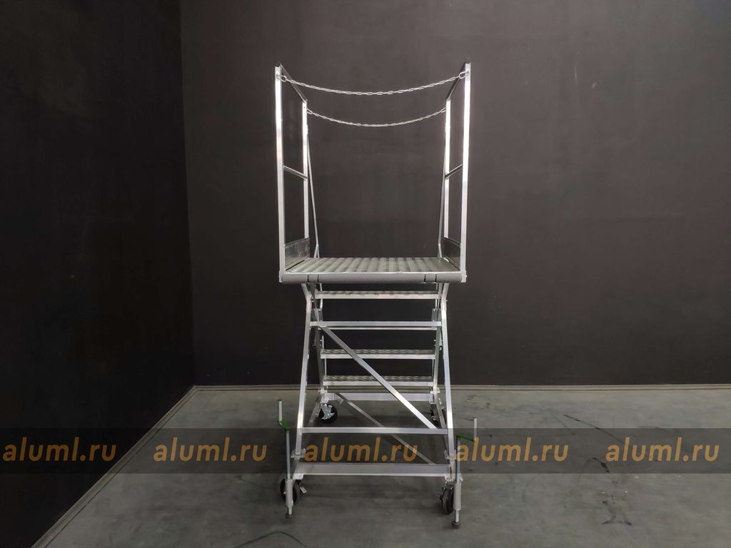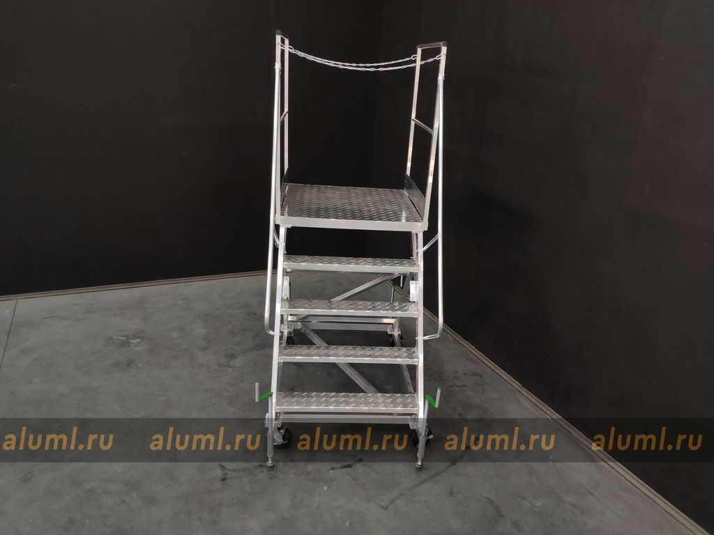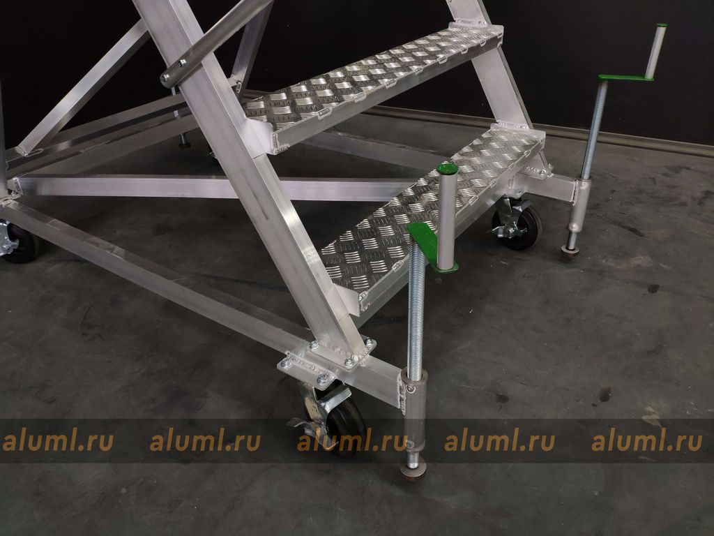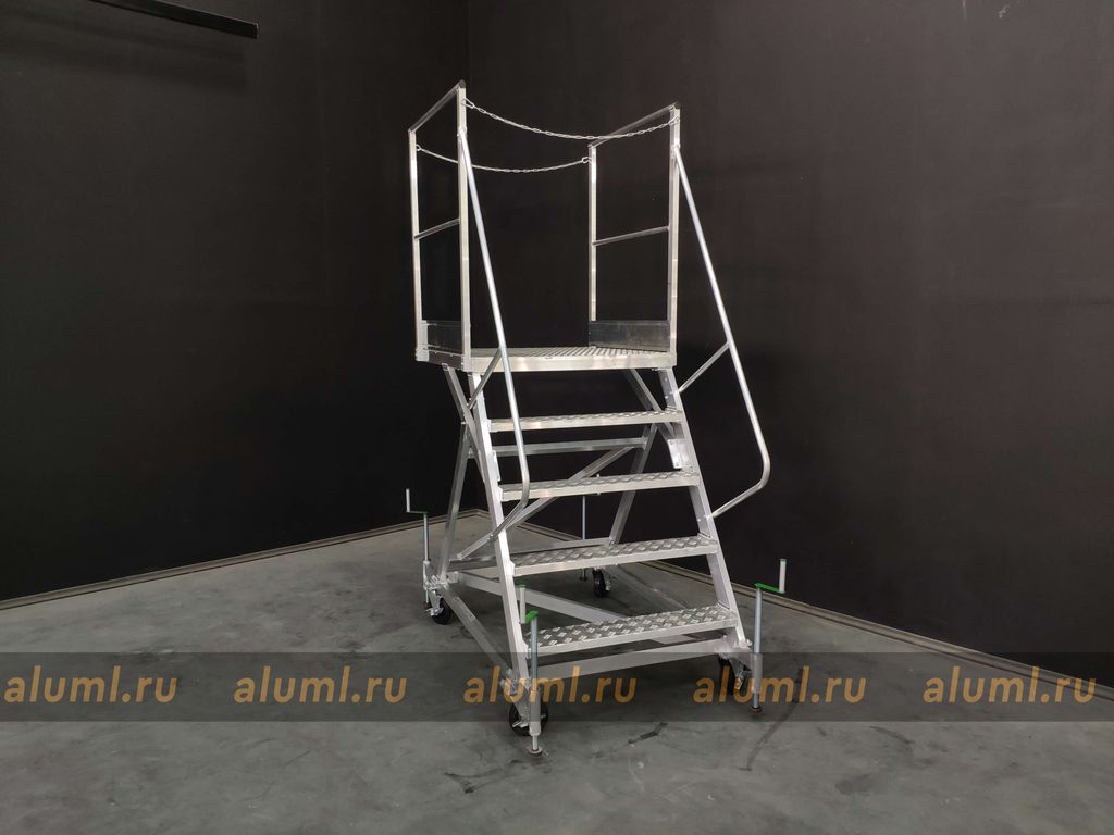 Передвижная алюминиевая стремянка – это сварная конструкция, изготовленная из алюминиевых сплавов, с перфорированными настилами площадки и ступеней. Особенностью этой лестницы является её собственная устойчивость в рабочем положении, которая позволяет обойтись без крепления к несущим конструкциям зданий или сооружений. Благодаря колесным опорам, стремянка может удобно перемещаться вдоль фронта работ. Вертикальные стойки изготовлены из алюминиевого профиля прямоугольного сечения. Для обеспечения дополнительной устойчивости конструкции, кроме колесных опор, предусмотрены четыре винтовых опоры. Огражденная площадка по бокам создана для обеспечения безопасности и удобства во время работ на высоте, а также для формирования рабочей зоны вблизи места выполнения задач.
